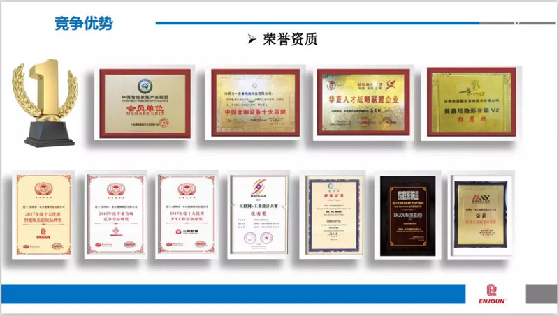 英嘉尼所研發(fā)的產(chǎn)品已獲得三十多項國家專利,其中包括發(fā)明專利、實用新型專利、外觀專利及軟件著作權(quán)。英嘉尼連續(xù)多年榮獲年度十大優(yōu)秀智能影院品牌獎,產(chǎn)品創(chuàng)新藍點獎,工業(yè)設(shè)計優(yōu)秀獎,家庭影院優(yōu)秀推薦獎等。目前,英嘉尼體驗店已遍布全國各個省市,產(chǎn)品應(yīng)用案例遍布全球,深受廣大用戶的認可!