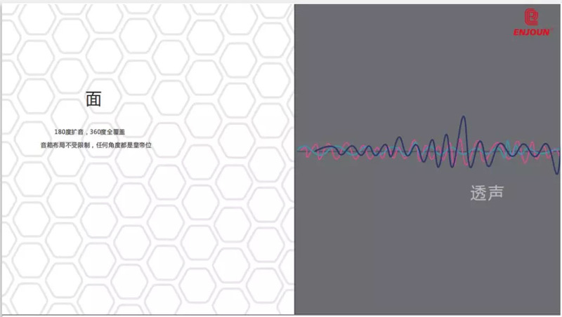 面:180°蜂窩板擴聲,360°全覆蓋,能在普通客廳環(huán)境下實現(xiàn)完美的音效效果,無需復(fù)雜的聲學(xué)建聲材料改造,節(jié)能環(huán)保,不易擾民;